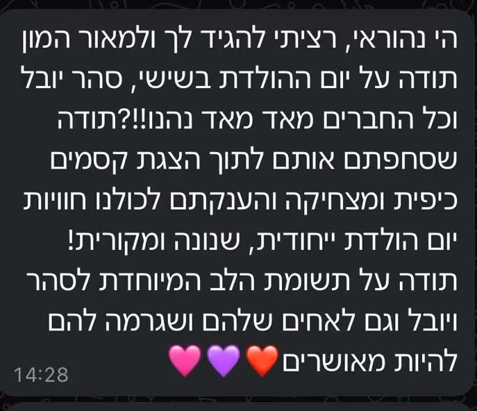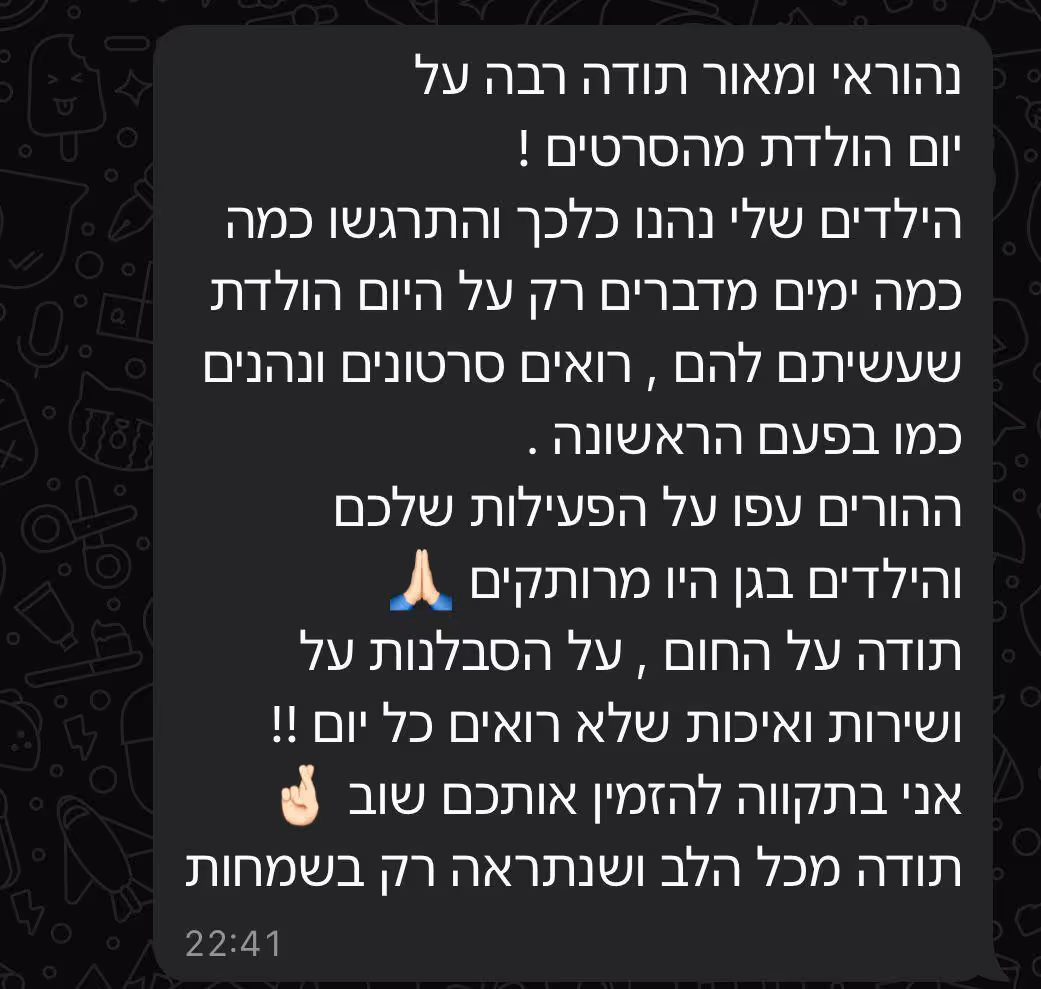 אנחנו מגיעים אליכם כשעה לפני האירוע כדי לארגן את הכל ולהכיר אתכם ואת חוגג/ת יום ההולדת.